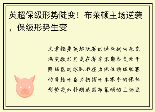 文章摘要:英超联赛的保级战向来充满变数,尤其是在赛季末期,各支处于降级区的球队都在为保住顶级联赛的资格而奋力拼搏。而本赛季的保级形势更加扑朔迷离,布莱顿的主场逆袭胜利成为了局势变化的关键。虽然布莱顿已经在积分榜上占据了一定优势,但其他保级球队仍在为争夺保级名额而展开激烈角逐。本文将从四个方面深入分析英超保级形势的急剧变化,首先会讨论布莱顿逆袭胜利的具体影响,其次会着重分析目前保级区球队的变化和表现,接着探讨英超保级战的技术层面和战术层面的变化,最后则会总结影响保级形势变化的关键因素,并对未来的英超保级形势进行展望。