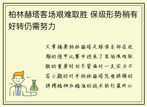 文章摘要:柏林赫塔足球俱乐部在近期的德甲比赛中迎来了客场艰难取胜的重要时刻。尽管面对一支实力不容小觑的对手,柏林赫塔凭借顽强的拼搏精神和精准的战术执行,最终以1-0战胜了对方,迎来了久违的胜利。这一胜利不仅让球队的积分榜排名有所回升,还极大增强了他们的保级信心。然而,虽然形势略有好转,柏林赫塔距离完全摆脱降级危险仍有较长的路要走。球队的保级形势虽然有所改善,但要保持这一势头并顺利保级,依然需要在接下来的比赛中付出更多努力和智慧。本文将从四个方面详细阐述柏林赫塔客场艰难取胜后,保级形势的稍微好转以及他们仍需继续努力的原因。