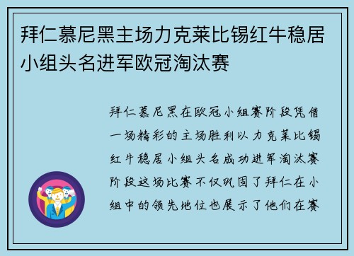 拜仁慕尼黑主场力克莱比锡红牛稳居小组头名进军欧冠淘汰赛