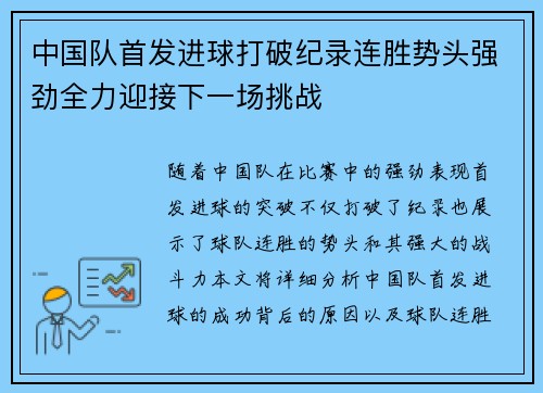 随着中国队在比赛中的强劲表现,首发进球的突破不仅打破了纪录,也展示了球队连胜的势头和其强大的战斗力。本文将详细分析中国队首发进球的成功背后的原因,以及球队连胜纪录的保持与突破,最后讨论中国队如何全力以赴迎接未来的挑战。我们将从多个方面进行阐述,探讨中国队的战术执行、球员个人表现、团队协作以及比赛精神等因素,进一步分析如何保持这一势头,在接下来的比赛中继续取得优异的成绩。
