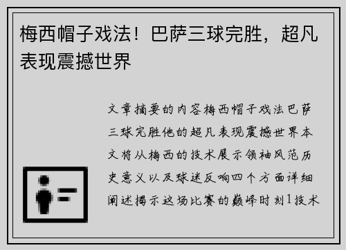 文章摘要的内容:梅西帽子戏法,巴萨三球完胜,他的超凡表现震撼世界。本文将从梅西的技术展示、领袖风范、历史意义以及球迷反响四个方面详细阐述,揭示这场比赛的巅峰时刻。