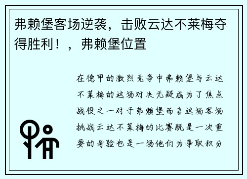 弗赖堡客场逆袭,击败云达不莱梅夺得胜利!,弗赖堡位置