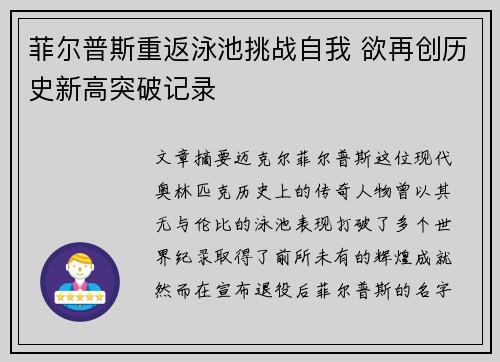 文章摘要:迈克尔·菲尔普斯,这位现代奥林匹克历史上的传奇人物,曾以其无与伦比的泳池表现打破了多个世界纪录,取得了前所未有的辉煌成就。然而,在宣布退役后,菲尔普斯的名字仍然频繁出现在媒体和体育新闻中。如今,这位游泳巨星宣布重返泳池,意在再次挑战自我,并有望突破自己曾经创造的历史新高。在这篇文章中,我们将深入探讨菲尔普斯重返泳池的原因、他面临的挑战、其对游泳界的意义以及未来的潜力,帮助读者全面理解菲尔普斯这一传奇人物如何在赛场上再次书写属于自己的新篇章。